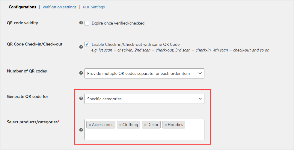 ↑ Back to topNow click the “Verification Settings” tab and choose the user roles you want to allow access to the QR code verification page. You can customize text and color of various messages like QR code is verified, invalid, and expired.