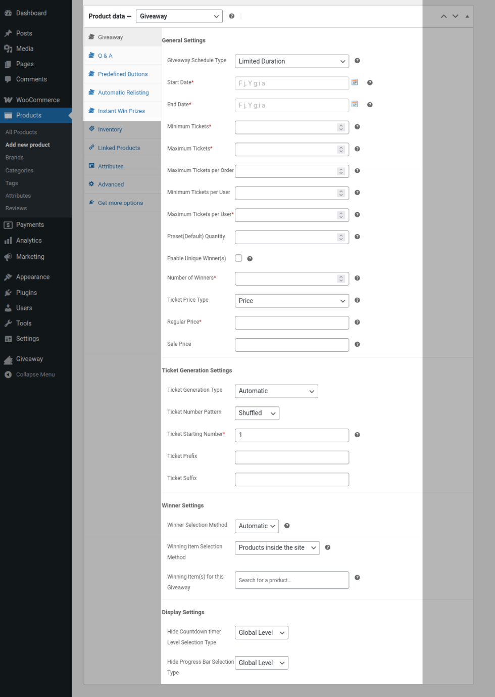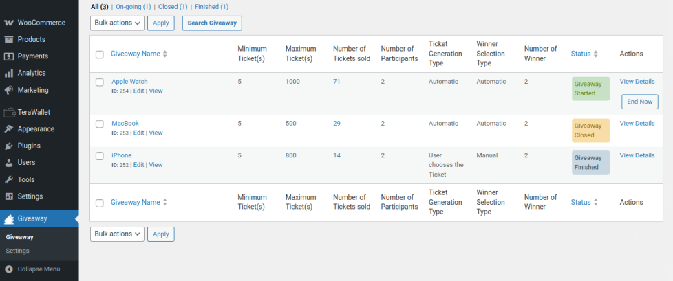 - By default, all giveaway products will be closed only when the end date has reached. If you want to close the giveaway products once all the tickets have been sold, you can do so by enabling the “Close Giveaway when All the Tickets have been Sold”.