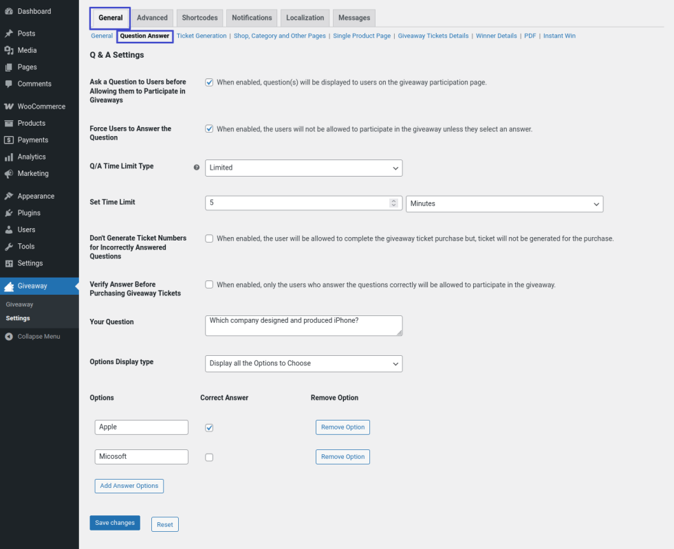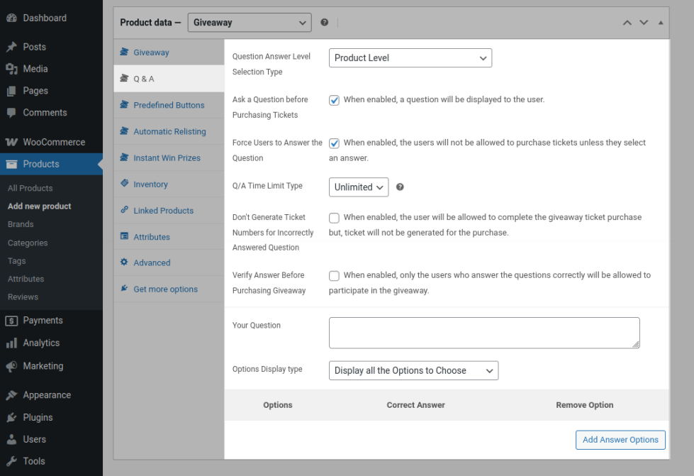 - By default, the user will be allowed to purchase a ticket once they select an answer. The answer will not be verified. If you want to allow your users to purchase tickets only when a correct answer is selected, enable the “Verify Answer Purchasing Giveaway”.
