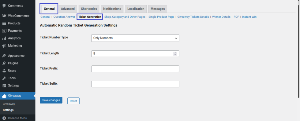 2. Also, you can achieve this scenario using Shuffled or Sequential ticket type. If you set the Ticket Starting Number as 00001 and set the maximum ticket as 99999, then it will generate the ticket number 00001 to 99999.Shuffled and Sequential options are available in the giveaway product settings(edit product page).