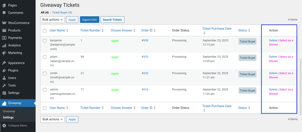 - By Default, the Giveaway will reach “Completed” status when their payment order reaches “Processing or Completed”. If you want to customize the order status, you can do so by modifying the “Order Status” option.