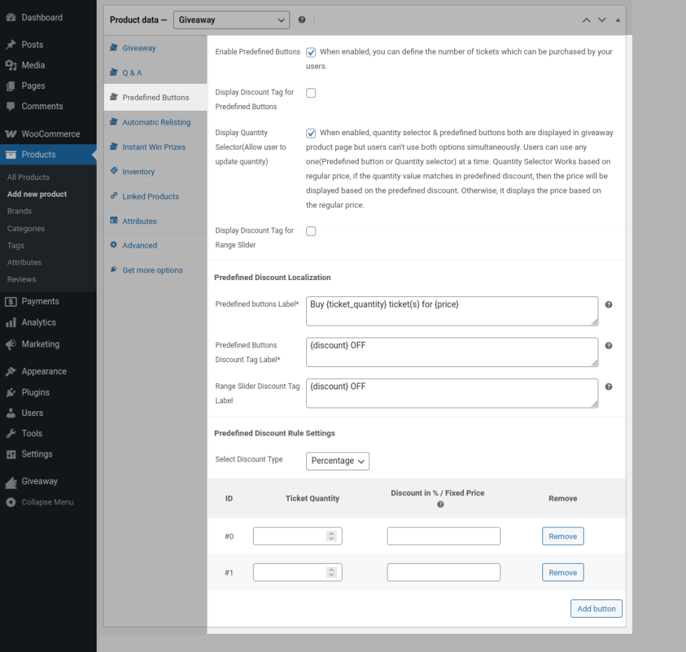 (ii) We have a Predefined Buttons option to apply Fixed price or Percentage discounts based on Giveaway ticket quantities.