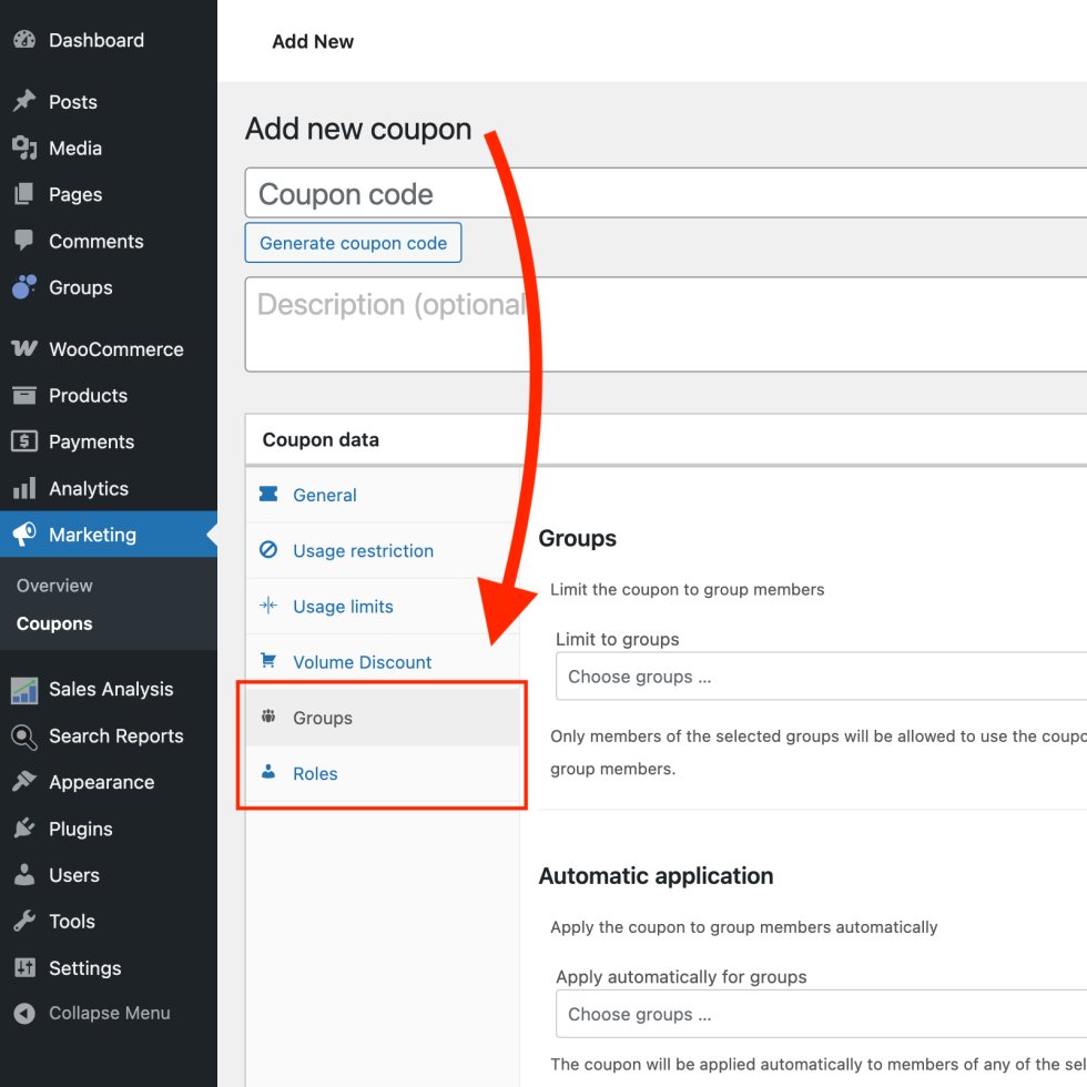 ↑ Back to topThe limiting groups, groups for which coupons are applied automatically and limiting roles are displayed in the Coupons section under Marketing > Coupons (previously under WooCommerce > Coupons) on your WordPress dashboard.
