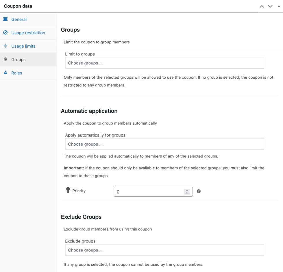 ↑ Back to topThe Groups subsection of the settings under Coupon data allows to limit the coupon to groups, apply it automatically to groups and to exclude certain groups from using it. You can access these sections when you add a new coupon or edit an existing coupon.