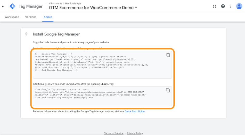 โ Back to topNow itโs time to embed the main Google Tag Manager snippet to your WooCommerce shop. If you havenโt done it before using another plugin or directly in the theme code you can navigate toย Settings > Google Tag Managerย and fill in two text areas at the top of the settings. The snippets to paste in those fields can be found inย Adminย pane in Google Tag Manager. Go toย Container > Install Google Tag Manager.