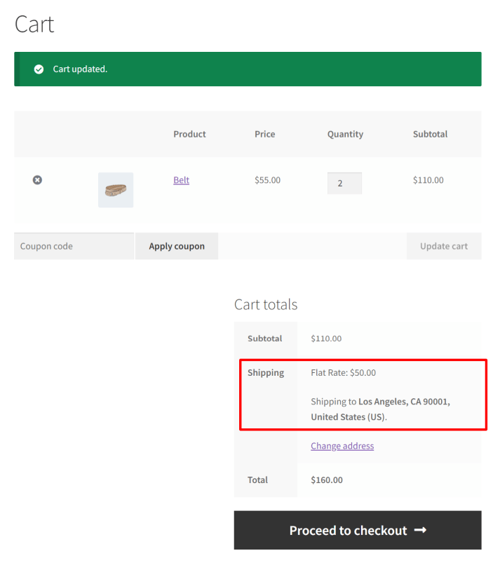Finally, when we move to the front-end of the WooCommerce store, the cart page now shows only the Free Shipping method for the United States region.