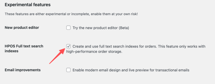 - If you select the High-performance order storage (recommended) option, the system will save order data within the new WooCommerce order tables.