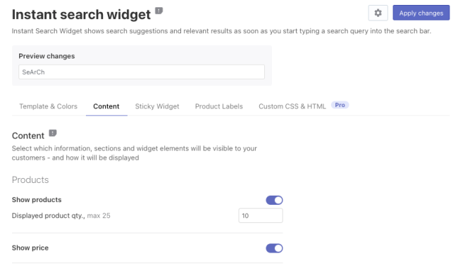 - Go to the Searchanise control panel > Search & Navigation > Instant search widget section > Content tab.