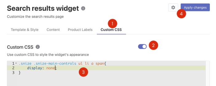 - Go to the Searchanise control panel > Search & Navigation > Search results widget section > Custom CSS tab.
