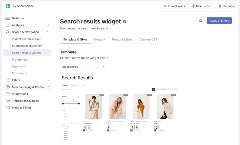 - Go to the Searchanise control panel > Search & Navigation > Search results widget section > Template & Style tab.