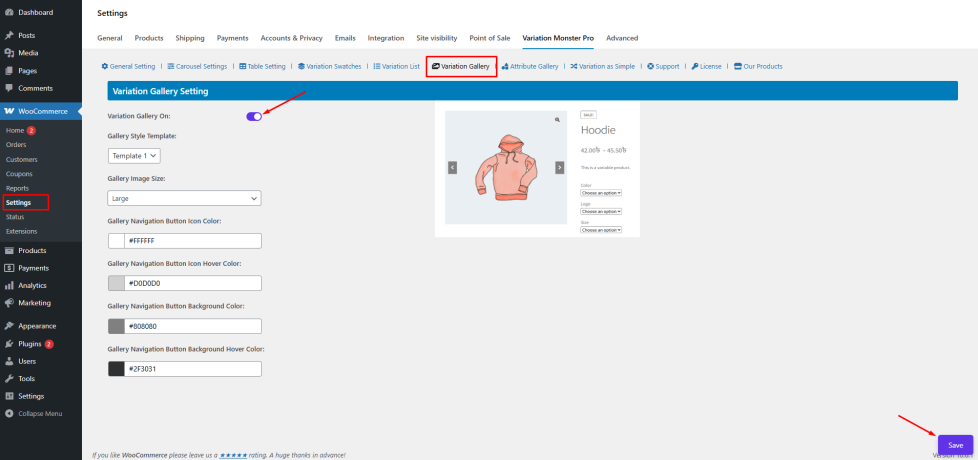 From here, you can configure all settings related to the Variation Gallery and manage how variation images are displayed on your store.