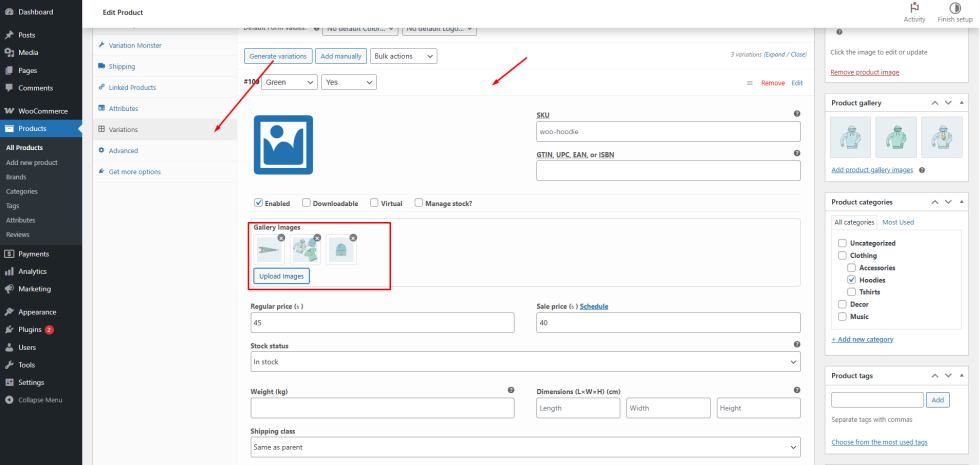 Once enabled, you can assign multiple images to each variation, instead of being limited to a single image as in the default WooCommerce system.