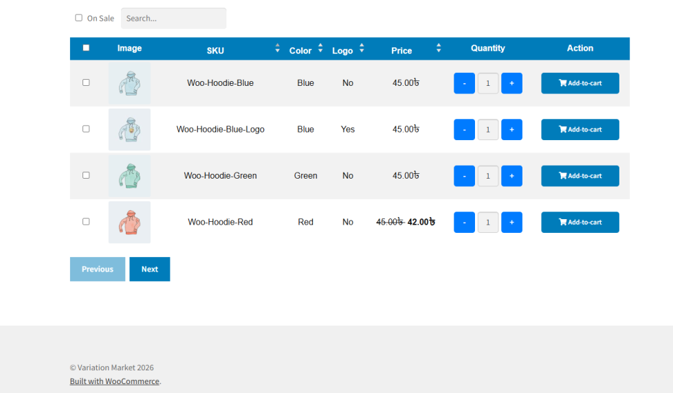 • The variation table will appear in the selected position on all applicable single product pages
