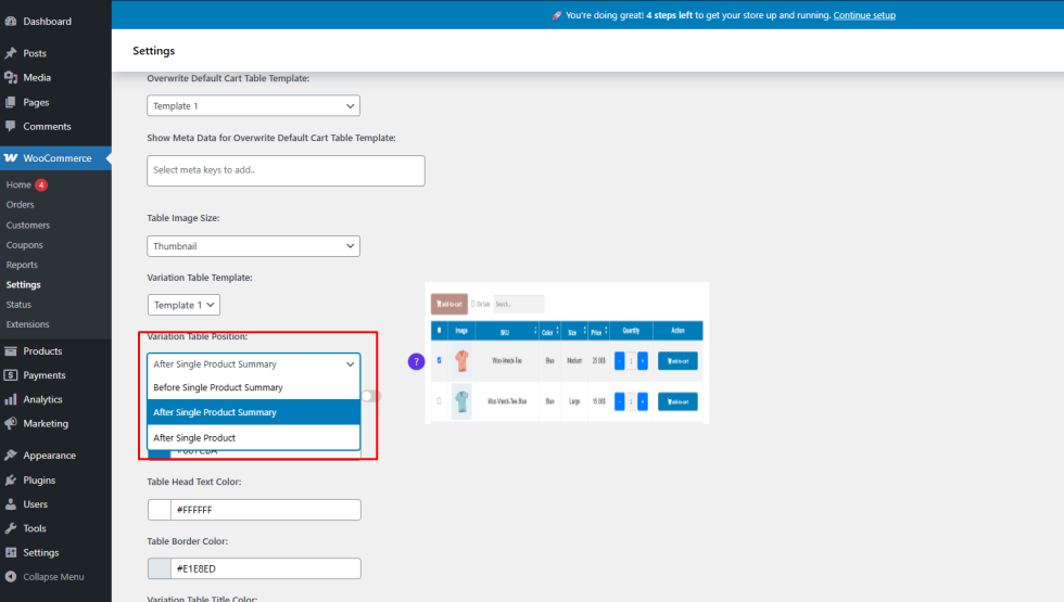 How to Configure the Variation Table Position on the Single Product Page