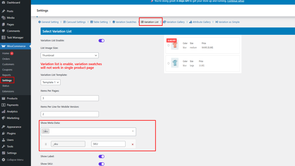 Step 1: Enable Meta Data for Variation List