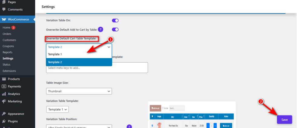 Click on the “Overwrite Default Cart Table Template” dropdown menu. Select your preferred layout, such as Template 1, from the list.Finally, hit the ‘Save‘ button to apply this change.