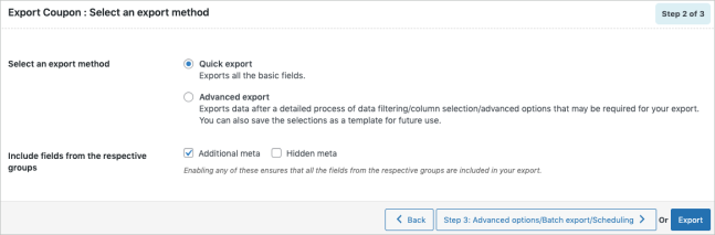 - Click the Export button to complete the action or proceed to Step 3 for advanced options.