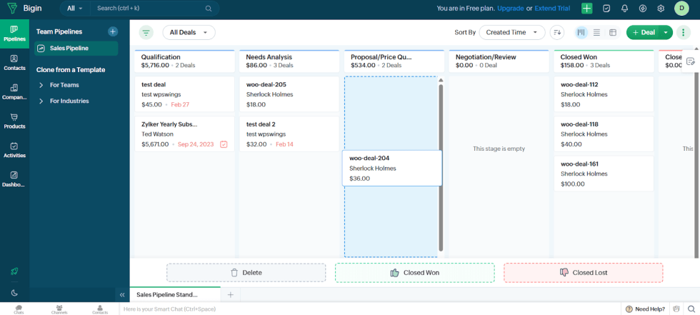 For example, if the “Qualification” stage in Bigin is connected to the “On Hold” status in WooCommerce, moving an order to “Qualification” in Bigin will automatically change it to “On Hold” in WooCommerce.