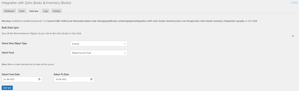 - Bulk Data Sync: Sync all the WooCommerce objects of your site to Zoho Books in one click.