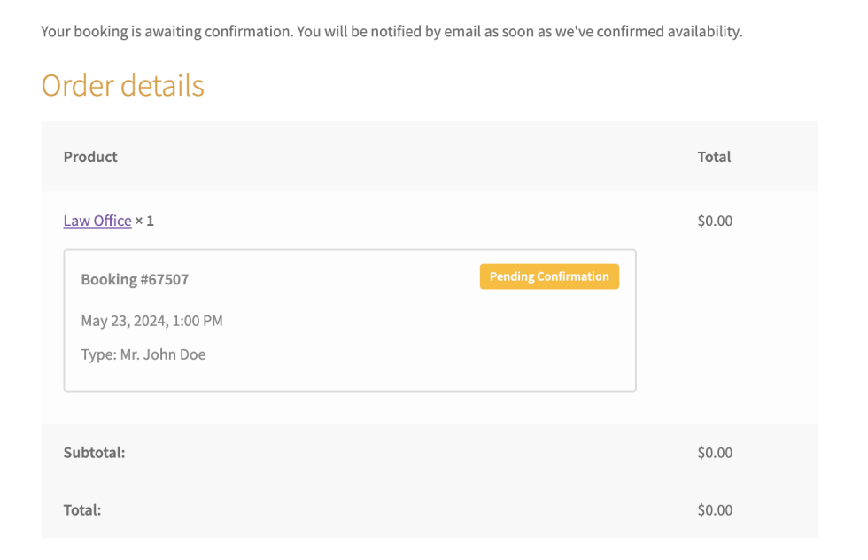 ↑ Back to topJohn and Jane have a law office. Clients can choose who they want to make an appointment with and select a date and time, excluding holidays. The booking requires the law office to confirm the booking, and customers can cancel their meeting up to 7 days before the appointment. Note that because the law firm requires to approve the booking first before it’s fully booked, payment will not be taken at initial time of checkout.