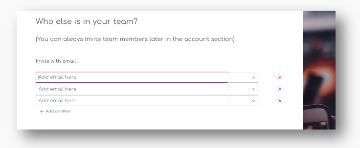 The second step in the onboarding is to invite Team Members for your store. You can do this as part of the onboarding, but you can also choose to do this at a later stage. (For more information on how to do this, please have a look at the support pages Invite Your Team).