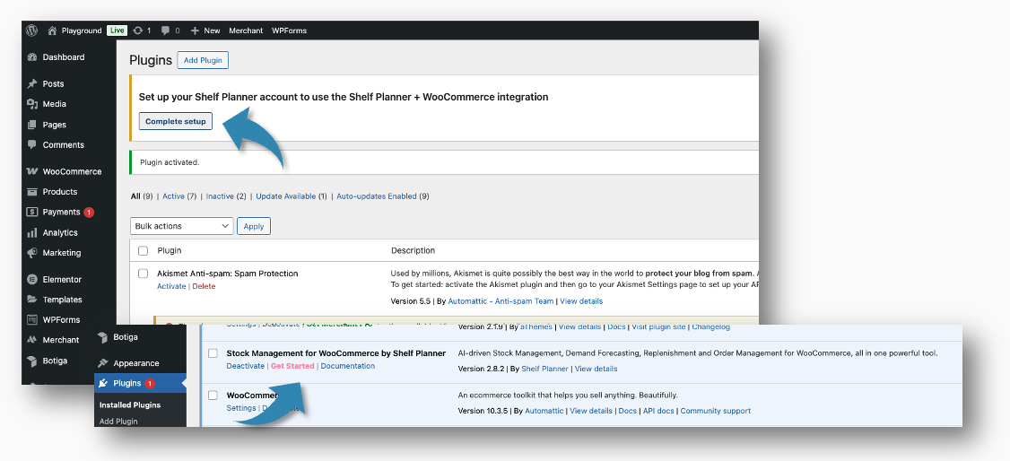 ↑ Back to topAfter installation and activation of the extension on your store, you will have to create an account and connect Shelf Planner to your store. On the plugin pages in your store, you can either use the ‘Complete setup’ notification on top of the page, or the ‘Get Started’ link in the plugin description: