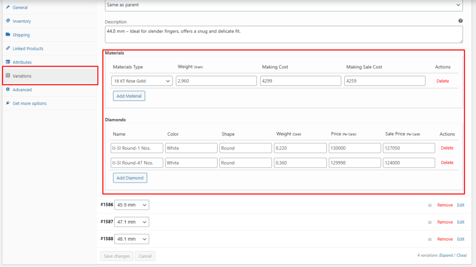 Each variation can have its own unique combination of materials and diamonds. This ensures that the product price is accurately calculated based on the selected variation, providing your customers with a clear and transparent price structure.