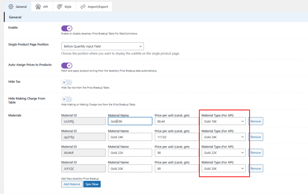 After enabling the API, you can configure your materials to link with the live price updates. In the Materials section under General Settings, you will find a field named Material Type (For API) for each material you have added. Here, you can select the appropriate material type from the dropdown options, such as GOLD 24K, GOLD 22K, GOLD 21K, GOLD 20K, GOLD 18K, GOLD 16K, GOLD 14K, GOLD 10K, SILVER, PLATINUM, or PALLADIUM.