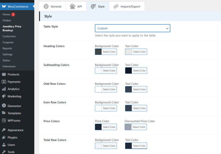 If you want full control over the appearance of your table, select the Custom option from the style dropdown. This will unlock a variety of color customization settings, allowing you to create a design that perfectly matches your website’s theme. You can customize: