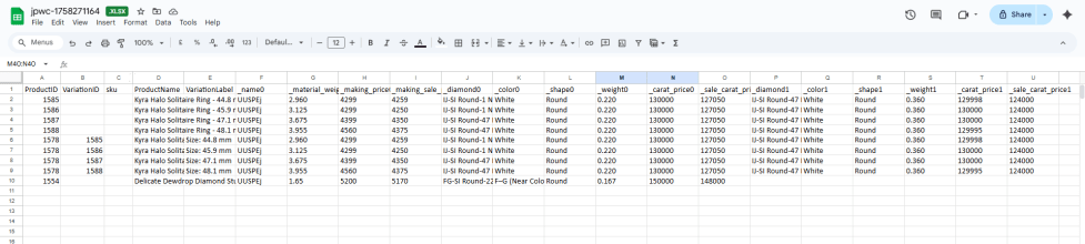You can export the existing jewellery price breakup data in an .xlsx format. This file will contain all the configured materials (metal, diamond, making charges, etc.) and their associated price details for the selected products or categories.