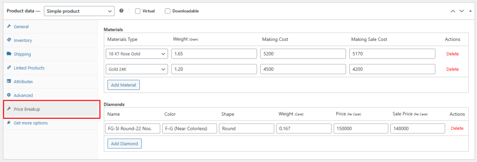 ↑ Back to topIn WooCommerce, variable products allow you to create different variations of a product (such as size, color, or weight). Each variation can have its own Price Breakup configuration, enabling you to define specific material and diamond details for accurate cost calculation.