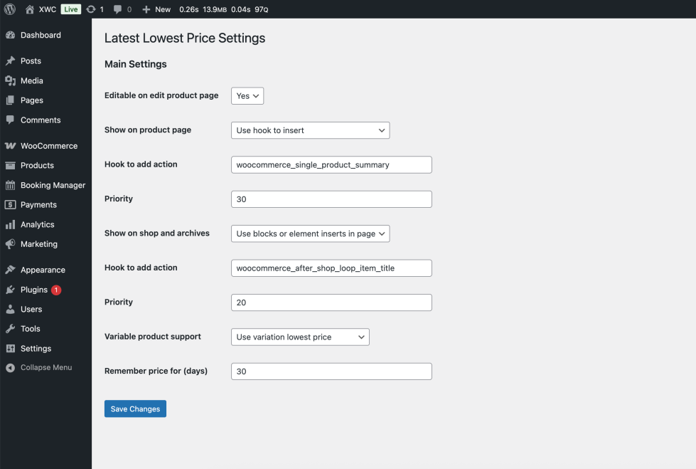 ↑ Back to topA more common way of integrating the extension is to use hooks and actions. Options for this are in the plugin settings page. In your WP Admin dashboard, navigate to Plugins > Latest Lowest Price > Settings. The settings link is next to the Deactivate button; you’ll need admin privileges to view it.