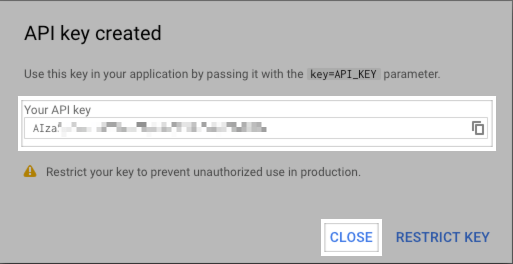 - Copy your newly created API Key and click Close. Do not click Restrict Key – this may cause Google to reject your geocoding requests from Local Pickup Plus. Your API Key will never be exposed to users on your site.