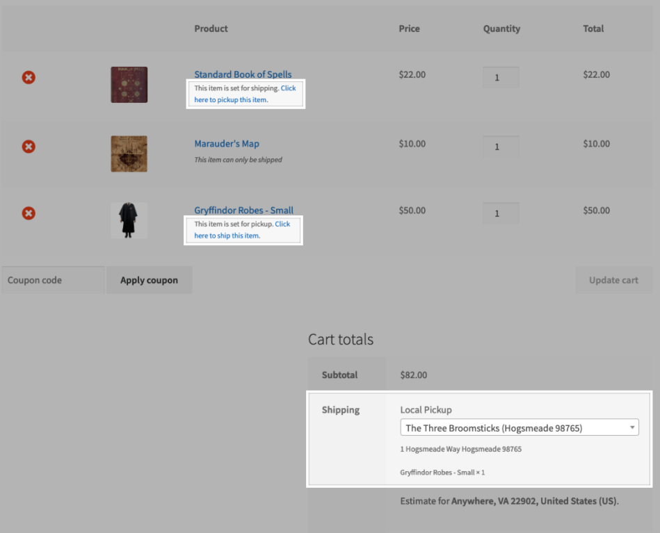 - If the Cart Item Handling setting lets customers choose which products to ship or pick up, they can toggle the handling method for each eligible item:
