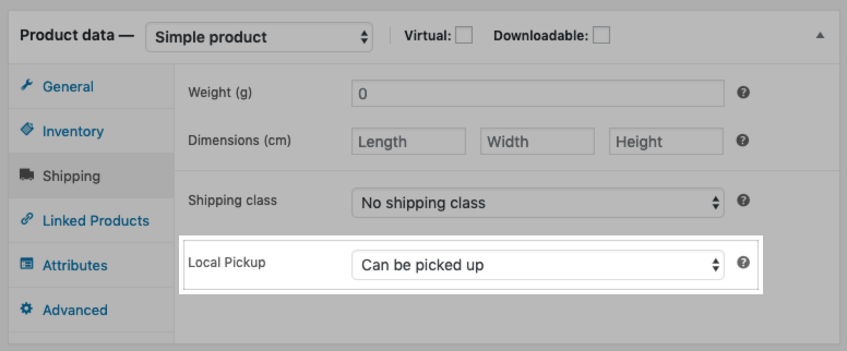 When creating or editing a product, go to the Shipping tab and update the Local Pickup field to determine if pickup is allowed, required, or if the prouct should follow its category-level settings. When a product and its category have different settings defined, Local Pickup Plus will follow the product-level settings.