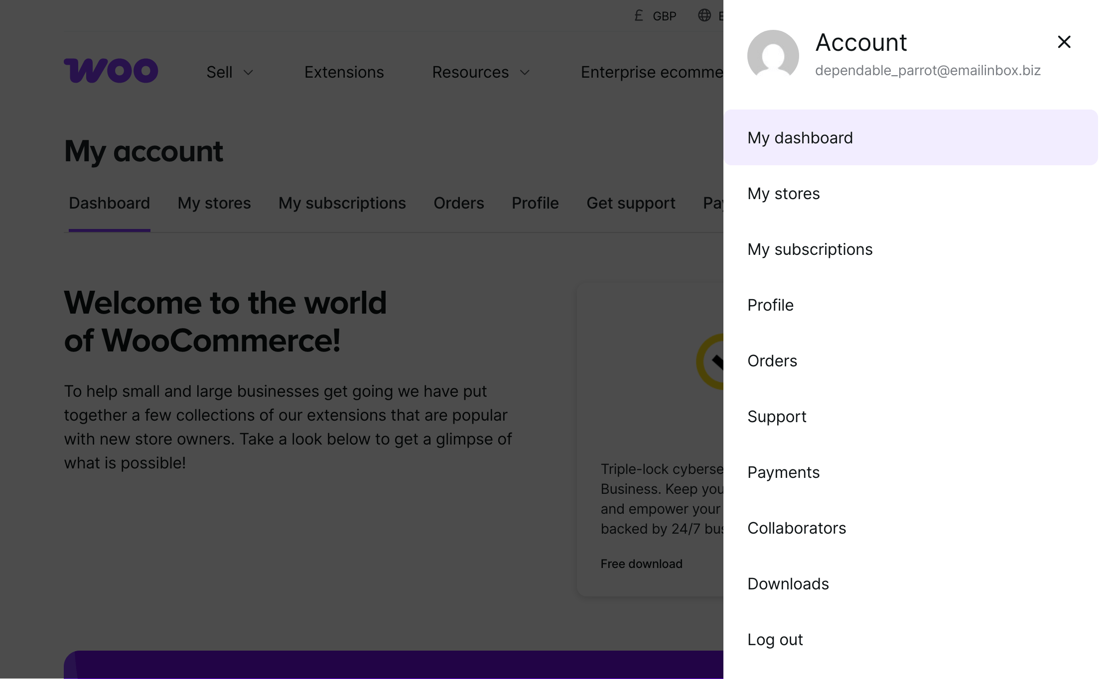 - From your WooCommerce.com account dashboard, click your Gravatar profile image near the top-right of the page.