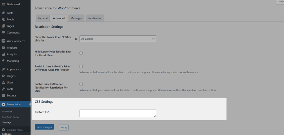 - By default, the lower price notifier link will be displayed for all users on your site. If you wish to display the lower price notifier link for particular users/user roles, then you can configure it using this option “Show the Lower Price Notifier Link for”.