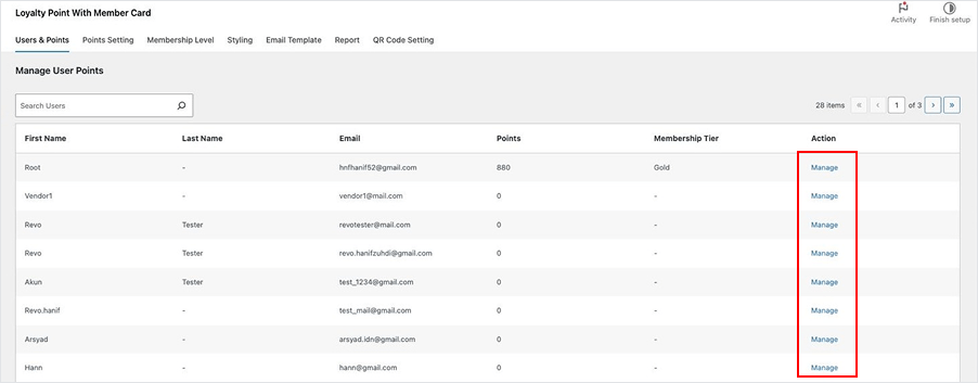 - Go to: Loyalty Points and Rewards with Member Card Admin Dashboard > Users & Points Settings > Manage User