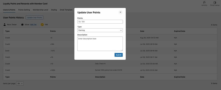 ↑ Back to topUser & Points Settings menu managing individual customer loyalty data, giving the admin full visibility and control over each user’s point activities and membership