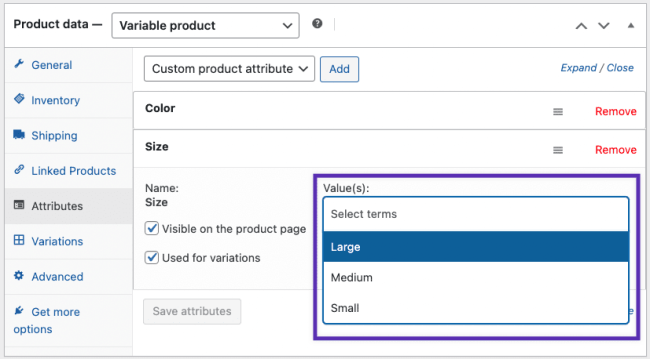 - Select the Attributes tab in the Product data meta box.