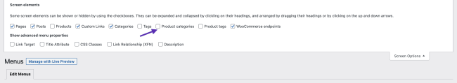 - From Appearance > Menu in the upper right corner, open the Screen Options menu by clicking the tab. Then select the Product categories checkbox