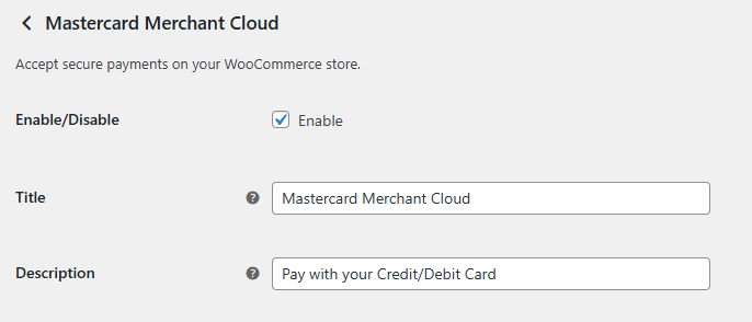 - In your WooCommerce admin, go to WooCommerce → Settings → Payments → Mastercard Merchant Cloud.