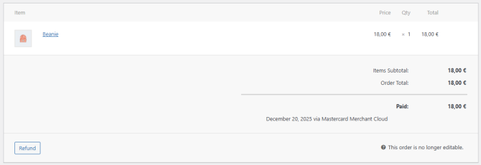 The refund will be registered in your Merchant Portal and reflected in WooCommerce once processed.