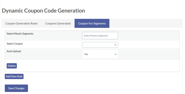 Go to the Coupon Codes section in the Mautic Integration for WooCommerce extension. Click on the Coupon Generation Rules tab there and then click on Add New Rule. Fill in all the required details and click on Save Changes to generate your new coupon code. Customers who belong to that rule will be able to use that coupon code.