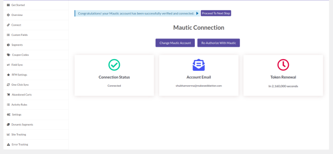 Once connected, you’ll get a message and a Proceed to the next step button. Click on it to move to the next step which is Mautic Custom Fields.