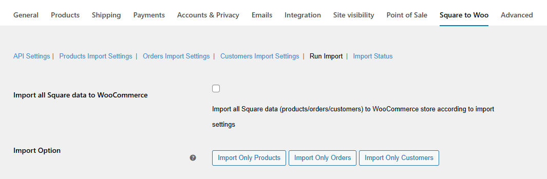โ Back to topNavigate to WooCommerce > Square to Woo > Run Import, click Import all Square Data to WooCommerce, and the extension will migrate products, orders, and customers based on your configured settings.