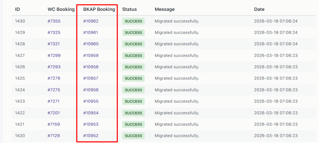 ↑ Back to topAfter the migration is complete, all successfully migrated bookings can be viewed in the migration logs table :