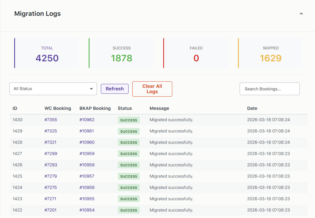 ↑ Back to topThe Migration Logs section provides a detailed record of all bookings processed during migration.