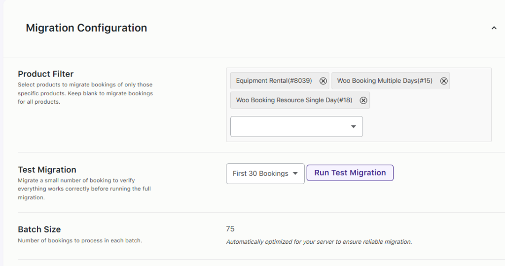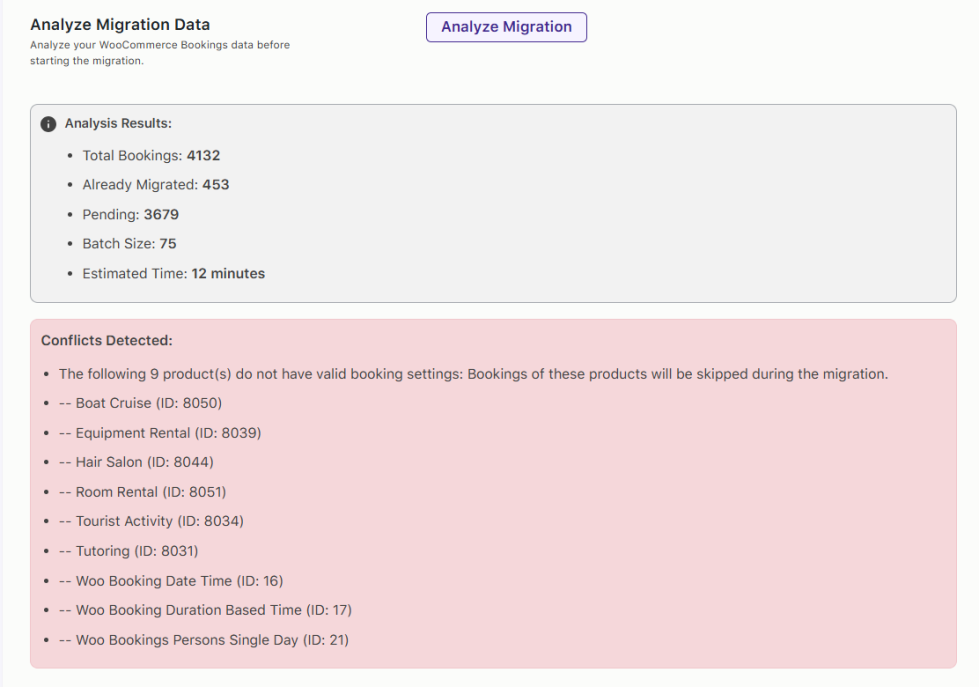 The migration tool relies on WooCommerce booking settings to correctly map and import booking data. If a product has a missing or invalid configuration, its bookings will be skipped and listed under Conflicts Detected section.