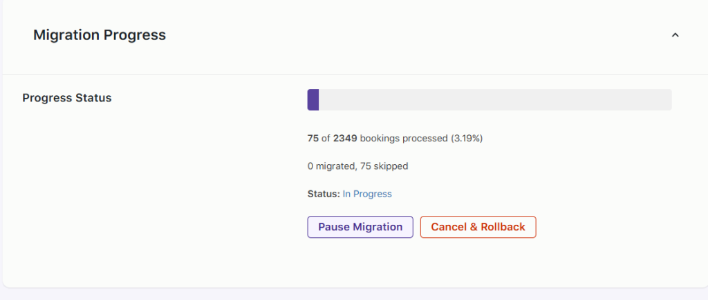 The migration process runs in the background and processes migrating bookings in batches to maintain performance and stability.
